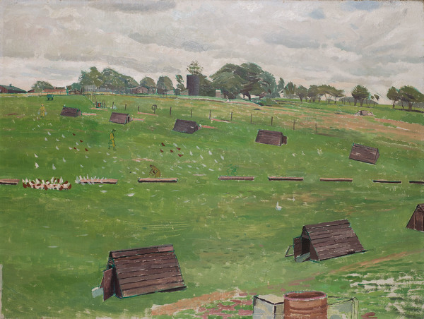 Night arks are fox-proof poultry roosts. The Sparsholt flocks are being fed by uniformed Land Girls. This painting was never submitted to the War Artists’ Advisory Council possibly on account of the lack of prominence given to the Land Girls.