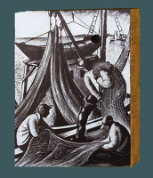 Clare Leighton attended the Brighton School of Art (1915), the Slade School of Fine Art (1921–23) and the Central School of Arts and Crafts. Despite her childhood nickname ‘The Bystander’, she became a hugely visible artist on both sides of the Atlantic, and her vast oeuvre includes engravings, paintings, bookplates, illustrations and stained glass. Her twelve plates for Wedgwood, New England Industries, 1952, are amongst her best-known work.